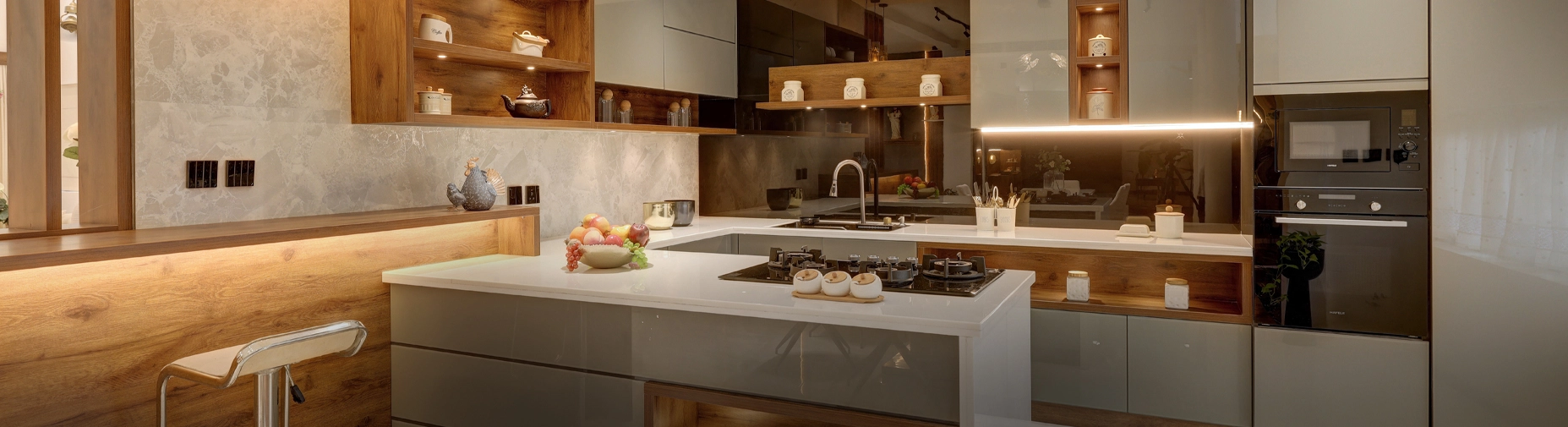 We at d2r Interiors believe that the key to a family’s health depends on the environment in which the food is prepared at their home. In this context, the kitchen’s design and hygiene are of prime importance. d2r Interiors is able to design the most sensible and convenient kitchen interior design solutions for our clients. We keep the little intricacies of hygiene in mind like the use of sunlight to place the wash area in order to prevent bacterial growth in these places. Also, things like the placement of the hob, exhaust, ease of cooking and height of kitchen counters, keeping the kitchen free of fungus, insects, and pests, and storage cabinets are also key parameters that we consider while designing a kitchen. Our team of experienced modular kitchen designers is able to design kitchens with these solutions in mind for our clients. Not only do our kitchens look good, they also provide practical ease of use and hygiene.In terms of look and appearance, we pay a lot of attention to the colour themes and materials used. Laminate finish, accurly finish, lacquer glass, PU finish, and linear finish are some of the various material finishes that we use in our designs. Marine Plywood, Multi-Wood, MDF materials ensure that the cabinets and shelves ensure a long life is free from rust. Such hygienic and modern kitchens are made possible by d2r Interiors. We use accessories and fittings from Hettich which is made from superior German Technology.