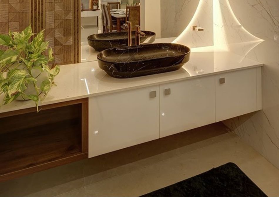 Features like a simple vanity unit, a sleek countertop, and neatly fitted fixtures create a neat and stylish base for the overall design. When clean lines are combined with soft textures and limited colours, the bathroom feels calm and well-balanced, rather than crowded or messy.
